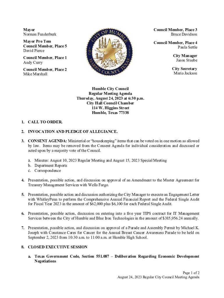 Mayor Norman FunderburkCouncil Member, Place 3 Bruce DavidsonMayor Pro Tem Council Member, Place 5 David PierceCouncil Member, Place 4 Paula Settle City Manager Jason StuebeCouncil Member, Place 1