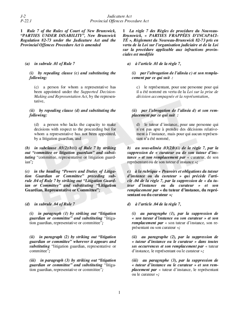J2 P22.1Judicature Act Provincial Offenses Procedure Act1 Rule 7 of the Rules of Court of New Brunswick, PARTIES UNDER DISABILITY, New Brunswick Regulation 8273 under the Judicature Act and the Provincial