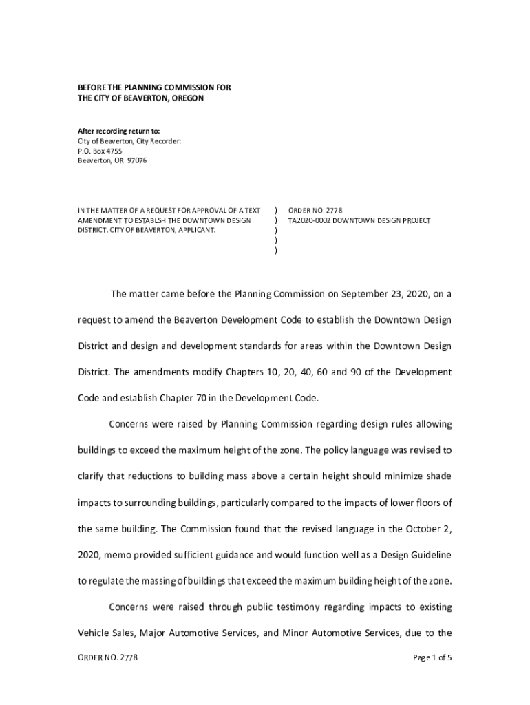 BEFORE THE PLANNING COMMISSION FOR THE CITY OF BEAVERTON, OREGONAfter recording return to: City of Beaverton, City Recorder: P.O. Box 4755 Beaverton, OR 97076IN THE MATTER OF A REQUEST FOR APPROVAL