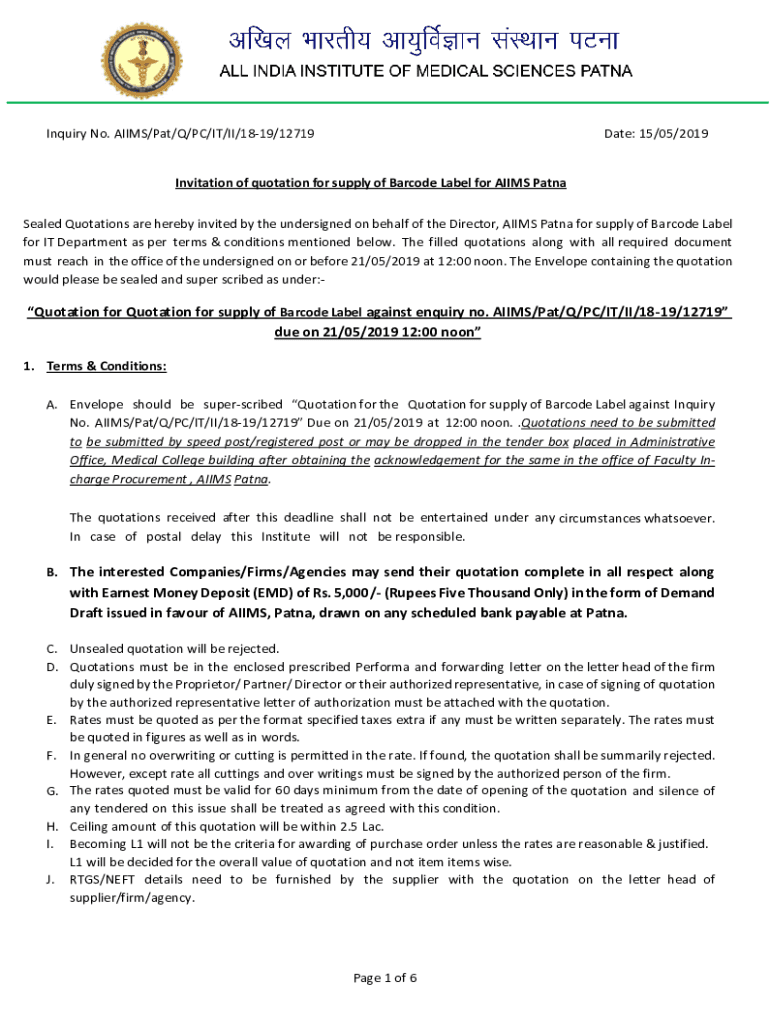 Inquiry No. AIMS/Pat/Q/PC/IT/II/1819/12719Date: 15/05/2019Invitation of quotation for supply of Barcode Label for AIMS Patna Sealed Quotations are hereby invited by the undersigned on behalf of the