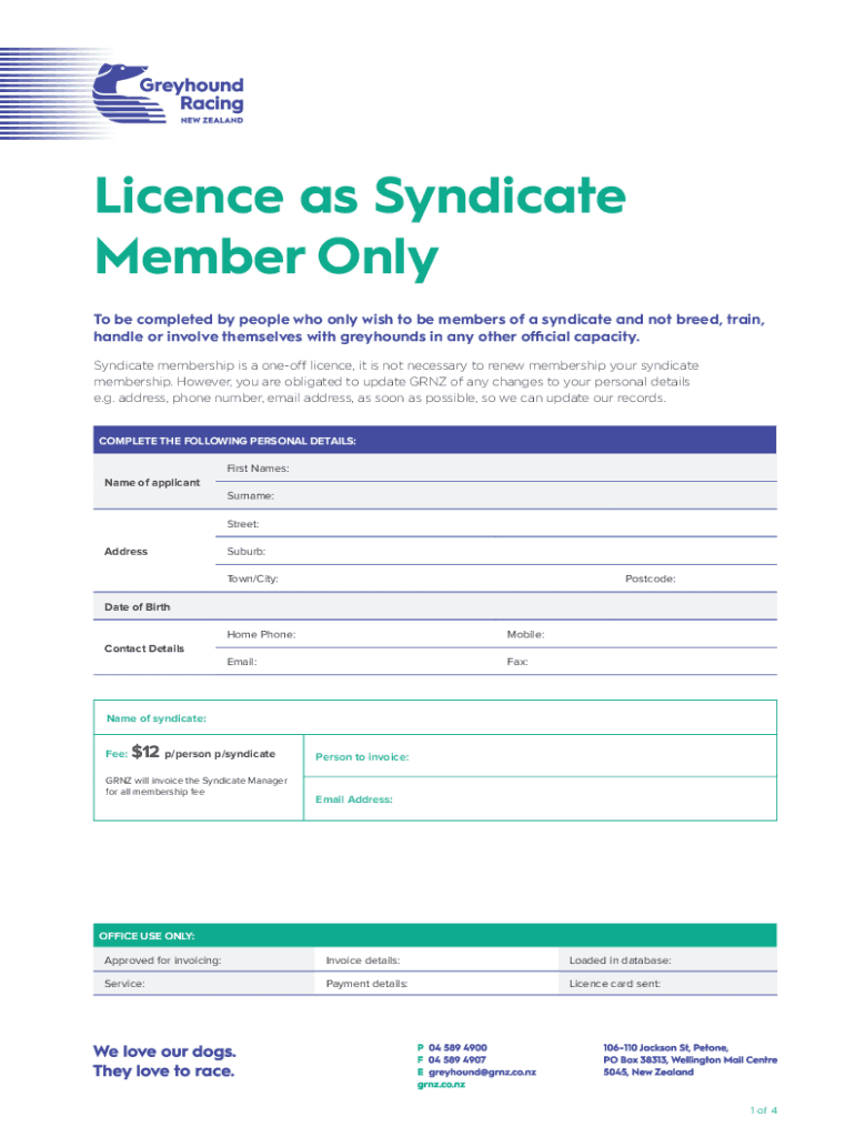License as Syndicate Member Only To be completed by people who only wish to be members of a syndicate and not breed, train, handle or involve themselves with greyhounds in any other official capacity.