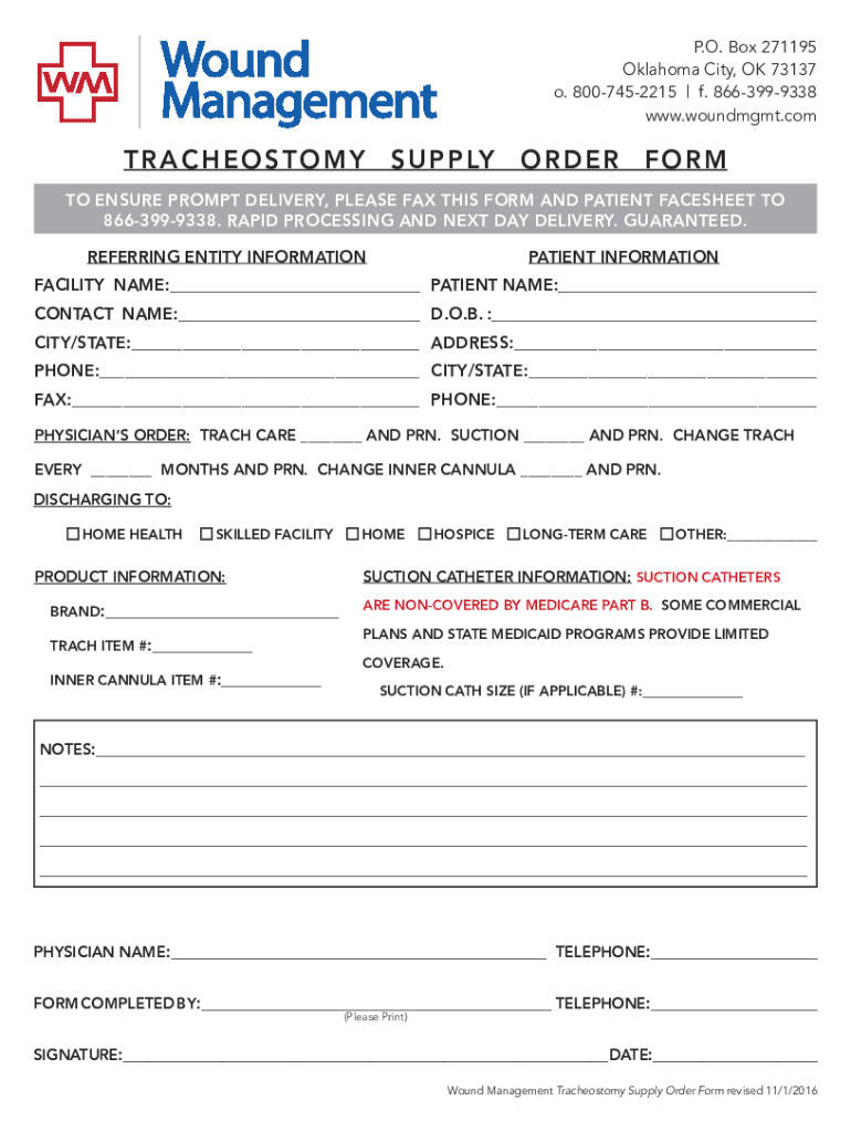 P.O. Box 271195 Oklahoma City, OK 73137 o. 8007452215 | f. 8663999338 www.woundmgmt.comTRACHEOSTOMYS U P LYORDERFORMTO ENSURE PROMPT DELIVERY, PLEASE FAX THIS FORM AND PATIENT FRESHEST TO 8663999338.