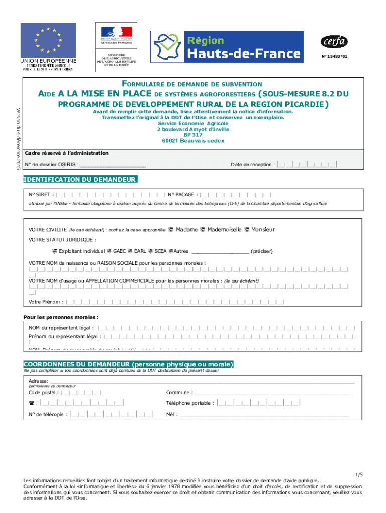 N 15483×01Version Du 4 December 2015FORMULAIRE DE DEMAND DE SUBVENTION AIDE À la MILE EN PLACE DE SYSTEM AGROFORESTRY (SAUSSURE 8.2 DU Program DE DEVELOPMENT RURAL DE LA REGION PICARDI) Savant DE