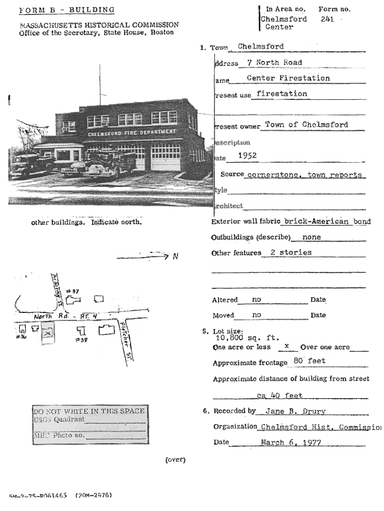 . IIN Area no.room B BUILDINGChelmsford GenterMASSACHUSETTS HISTORICAL COM.MISSION Office of FHE Secretary, State House, Boston 1. Conform no.241 Chelmsford.:......._.:.less 7 North Road ........\',
