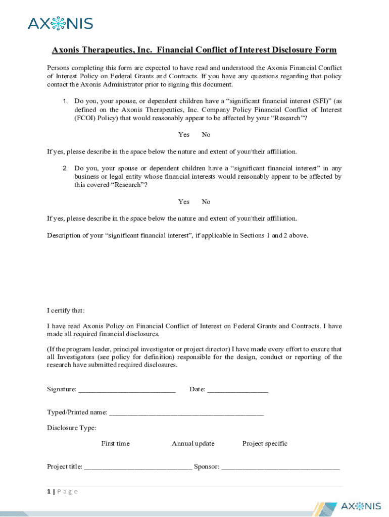Axons Therapeutics, Inc. Financial Conflict of Interest Disclosure Form Persons completing this form are expected to have read and understood the Axons Financial Conflict of Interest Policy on Federal