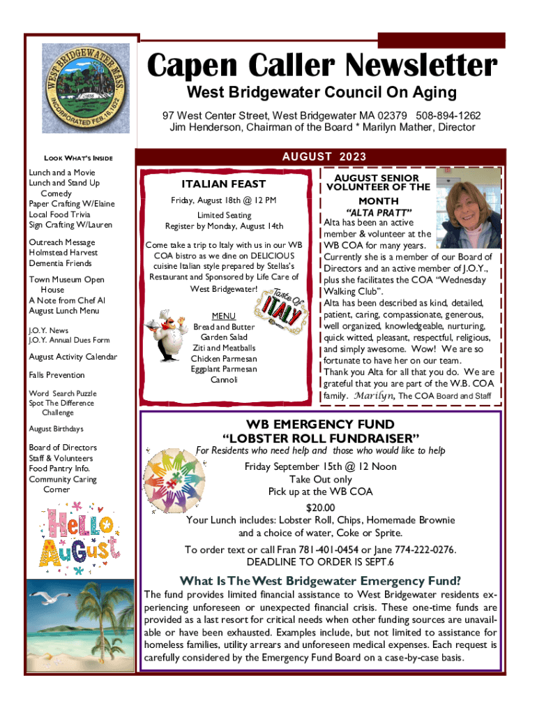 Cape Caller Newsletter West Bridgewater Council On Aging 97 West Center Street, West Bridgewater MA 02379 5088941262 Jim Henderson, Chairman of the Board * Marilyn Mather, DirectorAUGUST 2023LOOK