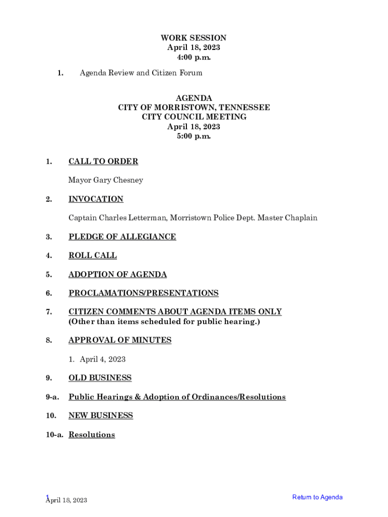 WORK SESSION April 18, 2023 4:00 p.m. 1. Agenda Review and Citizen Forum AGENDA CITY OF MORRISTOWN, TENNESSEE CITY COUNCIL MEETING April 18, 2023 5:00 p.m.1.CALL TO ORDER Mayor Gary Chesney2.INVOCATION