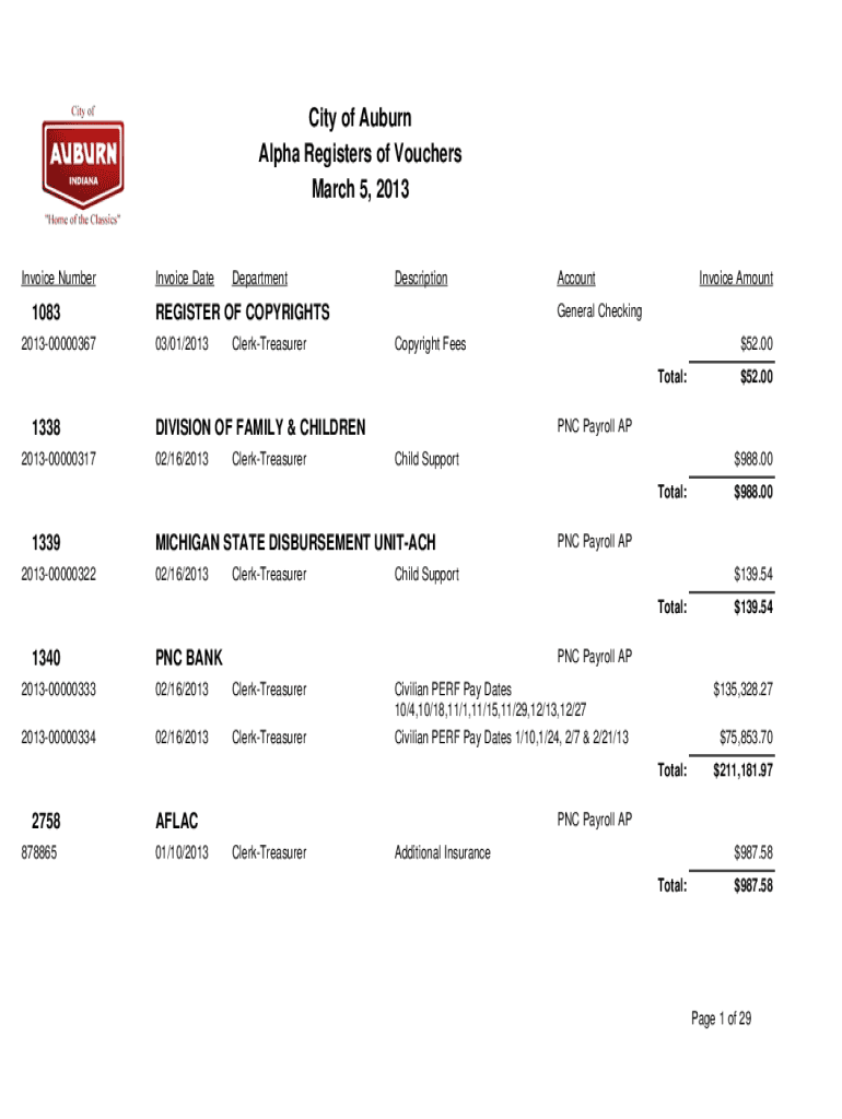 City of Auburn Alpha Registers of Vouchers March 5, 2013Invoice Number1083 201300000367Invoice DateDepartmentDescriptionClerkTreasurerInvoice AmountGeneral CheckingREGISTER OF COPYRIGHTS 03/01/2013AccountCopyright