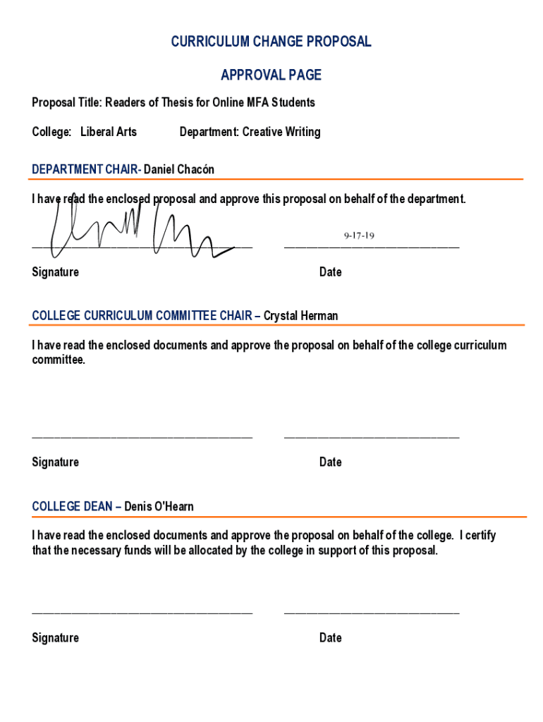 CURRICULUM CHANGE PROPOSAL APPROVAL PAGE Proposal Title: Readers of Thesis for Online MFA Students College: Liberal ArtsDepartment: Creative WritingDEPARTMENT CHAIR Daniel Chain I have read the enclosed