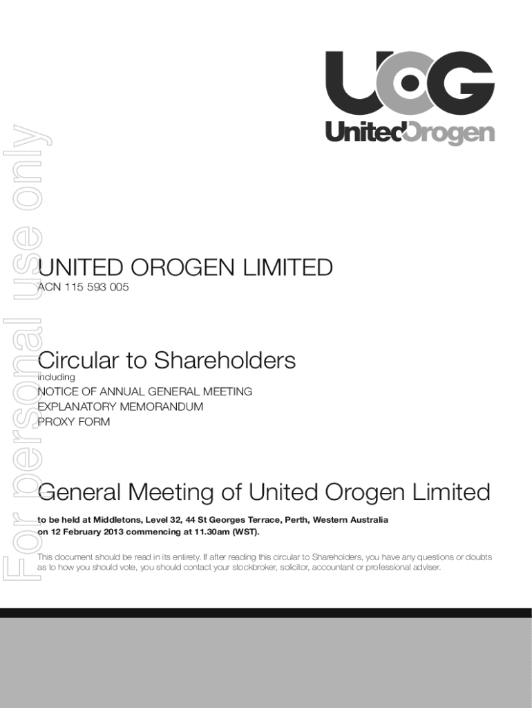 For personal use onlyUNITED OROGENY LIMITED ACN 115 593 005Circular to Shareholders includingNOTICE OF ANNUAL GENERAL MEETING EXPLANATORY MEMORANDUM PROXY FORMGeneral Meeting of United Orogeny Limited