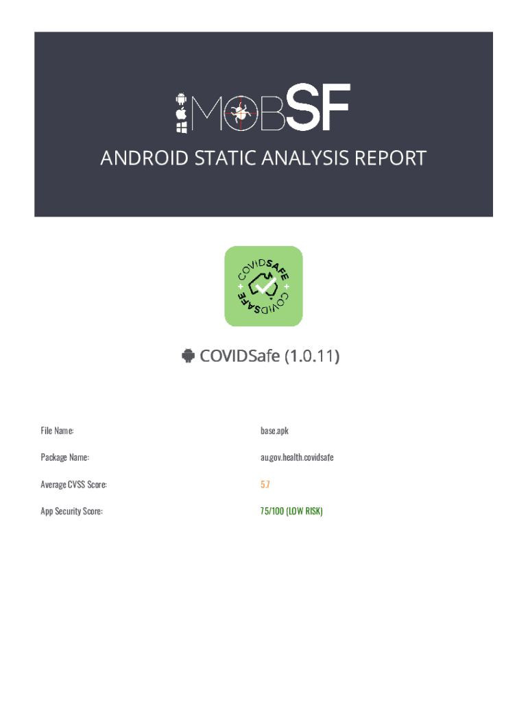 ANDROID STATIC ANALYSIS REPORT COVIDSafe (1.0.11)File Name:base.package Name:Au.gov.health.covidsafeAverage CSS Score:5.7App Security Score:75/100 (LOW RISK) FILE INFORMATION File Name: base.APK Size: