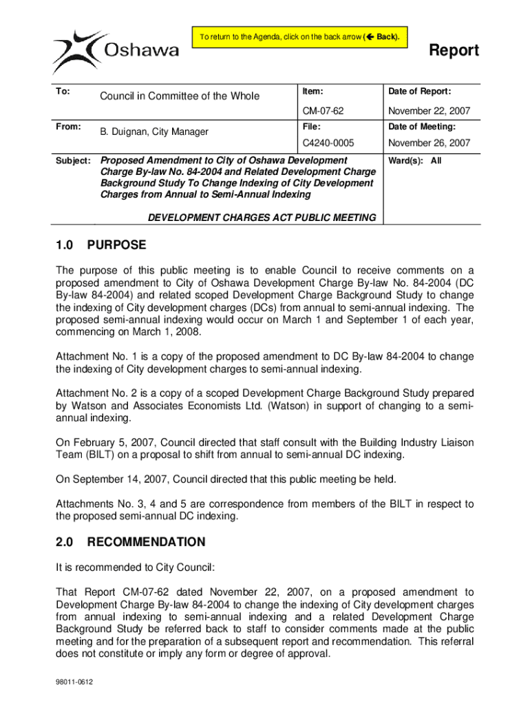 To return to the Agenda, click on the back arrow (Back). Report To:Council in Committee of the Wherefrom:B. Doorman, City ManagerSubject:Item:Date of Report:CM0762November 22, 2007File:Date of Meeting:C42400005November