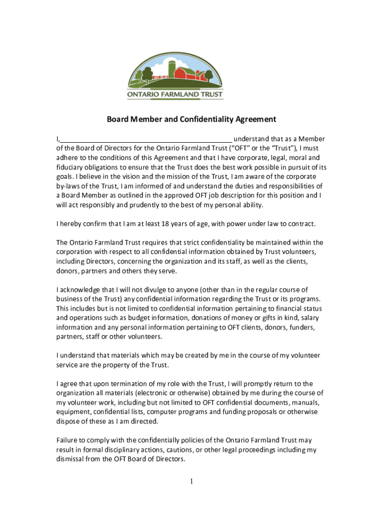 Board Member and Confidentiality Agreement, ___ understand that as a Member of the Board of Directors for the Ontario Farmland Trust (OFT or the Trust), I must adhere to the conditions of this Agreement