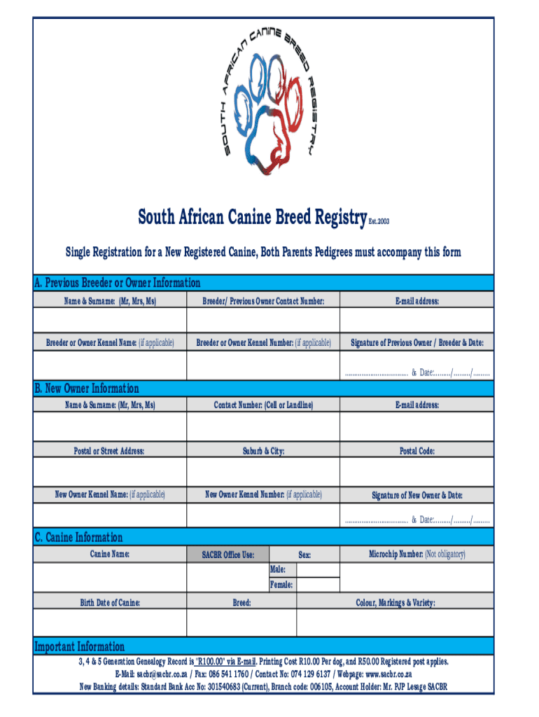 South African Canine Breed Registries.2003Single Registration for a New Registered Canine, Both Parents Pedigrees must accompany this form A. Previous Breeder or Owner Information Name & Surname: