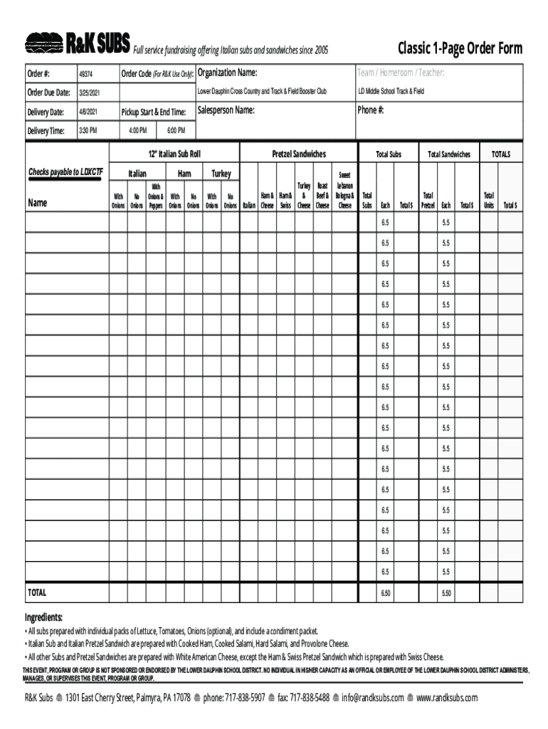 Classic 1Page Order Formula service fundraising offering Italian subs and sandwiches since 2005 Order #:49374Order Due Date:3/25/2021Delivery Date:4/8/2021Delivery Time:3:30 Order Code (For R&K Use