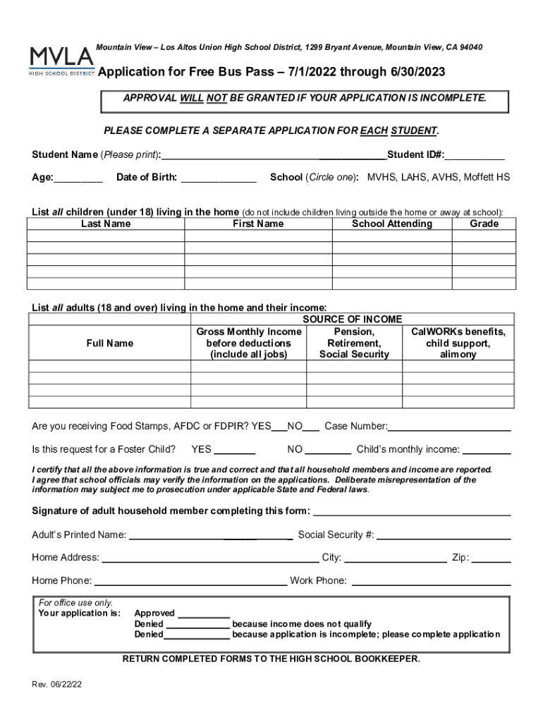 Mountain View Los Altos Union High School District, 1299 Bryant Avenue, Mountain View, CA 94040Application for Free Bus Pass 7/1/2022 through 6/30/2023 APPROVAL WILL NOT BE GRANTED IF YOUR APPLICATION