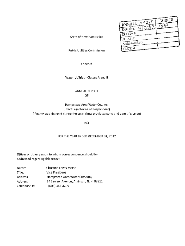 State of New HampshirePublic Utilities CommissionConcordWater Utilities Classes A and B ANNUAL REPORT OF Hempstead Area Water Co., Inc. (Exact Legal Name of Respondent (If name was changed during