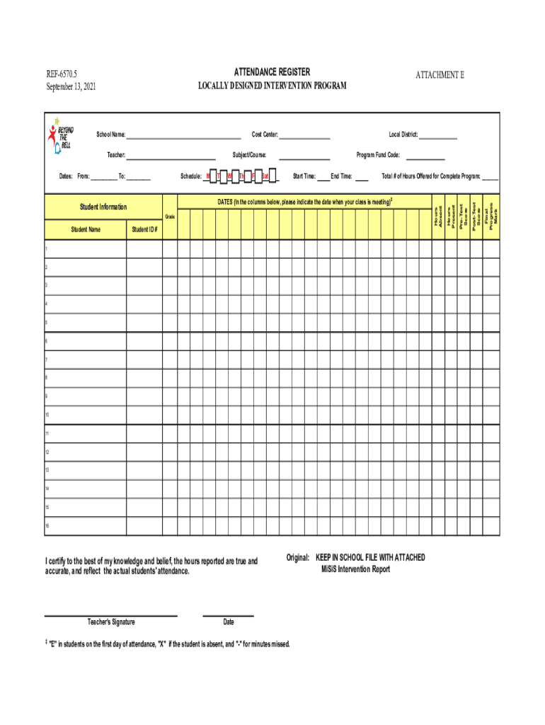 ATTENDANCE REGISTER LOCALLY DESIGNED INTERVENTION Programs Center:MTWThFSatStart Time:End Time:Total # of Hours Offered for Complete Program: ___DATES (In the columns below, please indicate the date