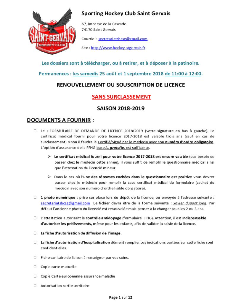 Sporting Hockey Club Saint Gervais 67, Impasse DE la Cascade 74170 Saint Gervais Courier : secretariatshcsg@gmail.com Site : http://www.hockeystgervais.frLes dossiers sent charger, of retired, et