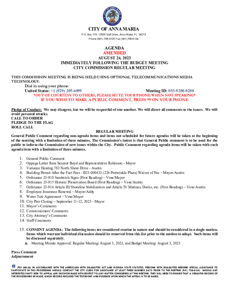CITY OF ANNA MARIA P.O. Box 779, 10005 Gulf Drive, Anna Maria, FL 34216 Phone (941) 7086130 Fax (941) 7086134AGENDA AMENDEDAUGUST 24, 2023 IMMEDIATELY FOLLOWING THE BUDGET MEETING CITY COMMISSION
