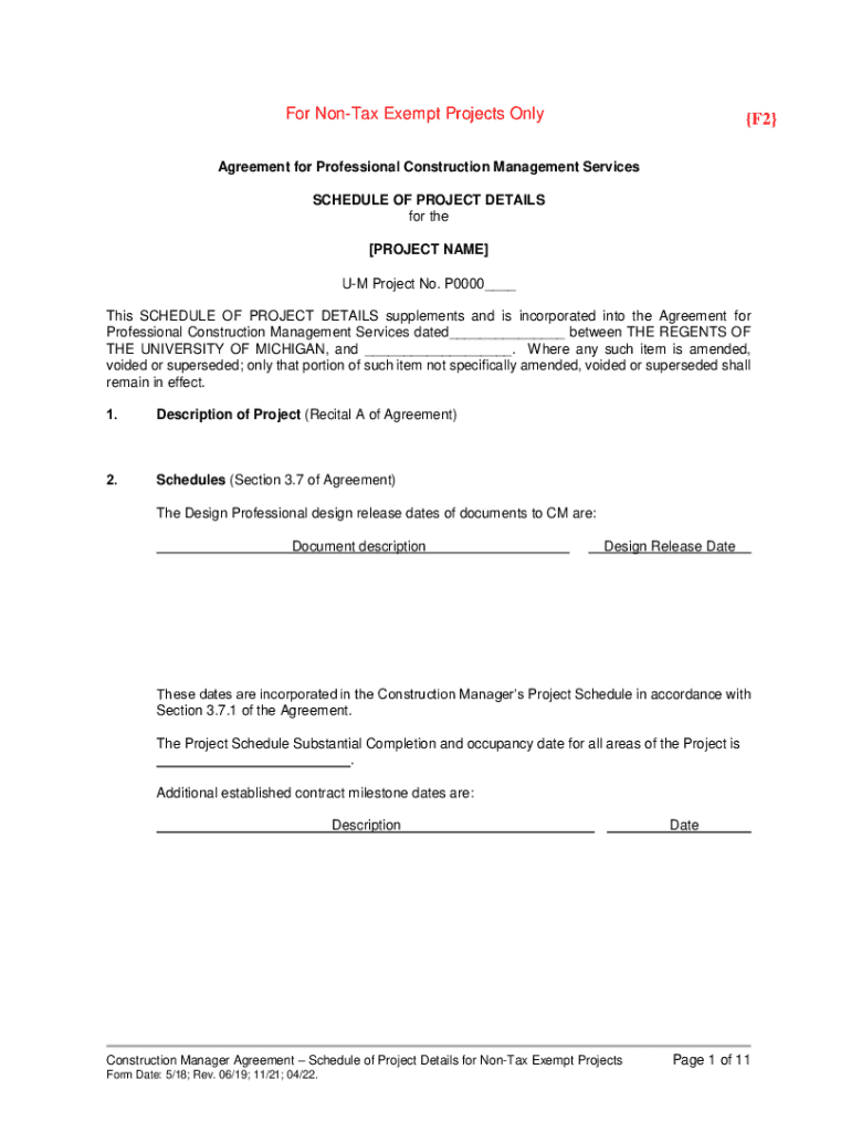 For Syntax Exempt Projects OnlyF2Agreement for Professional Construction Management Services SCHEDULE OF PROJECT DETAILS for the [PROJECT NAME] UM Project No. P0000___ This SCHEDULE OF PROJECT DETAILS