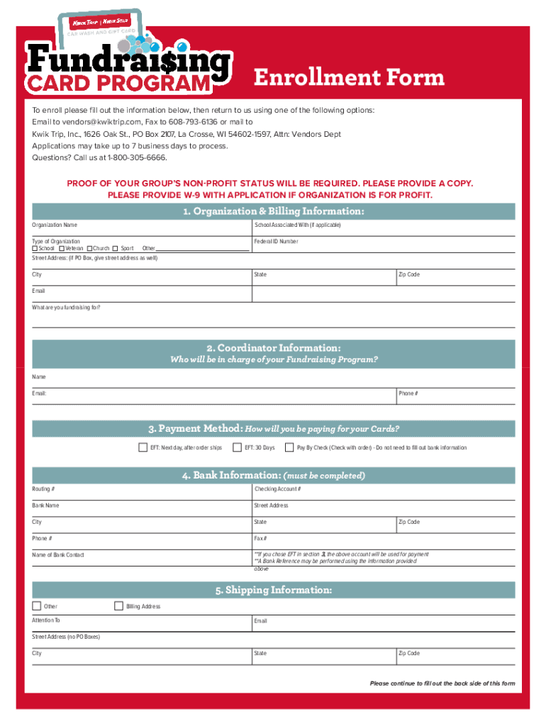 Enrollment Form To enroll please fill out the information below, then return to us using one of the following options: Email to vendors@kwiktrip.com, Fax to 6087936136 or mail to Win Trip, Inc., 1626