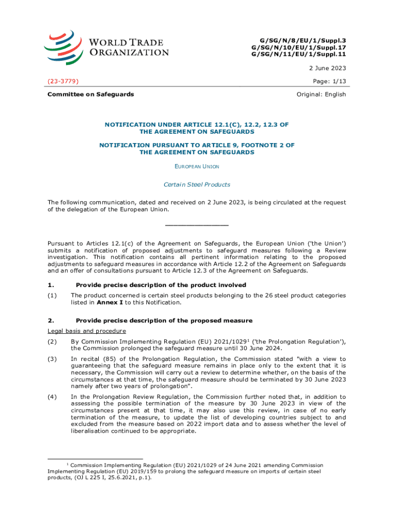 G/SG/N/8/EU/1/Suppl.3 G/SG/N/10/EU/1/Suppl.17 G/SG/N/11/EU/1/Suppl.11 2 June 2023 (233779)Page: 1/13Committee on SafeguardsOriginal: EnglishNOTIFICATION UNDER ARTICLE 12.1(C), 12.2, 12.3 OF THE AGREEMENT