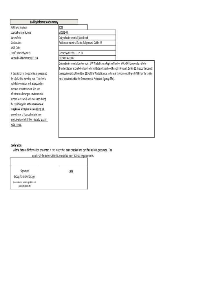 Facility Information Summary AER Reporting Year License Register Number Name of site Location NACE Code Class/Classes of Activity National Grid Reference (6E, 6 N)A description of the activities/processes