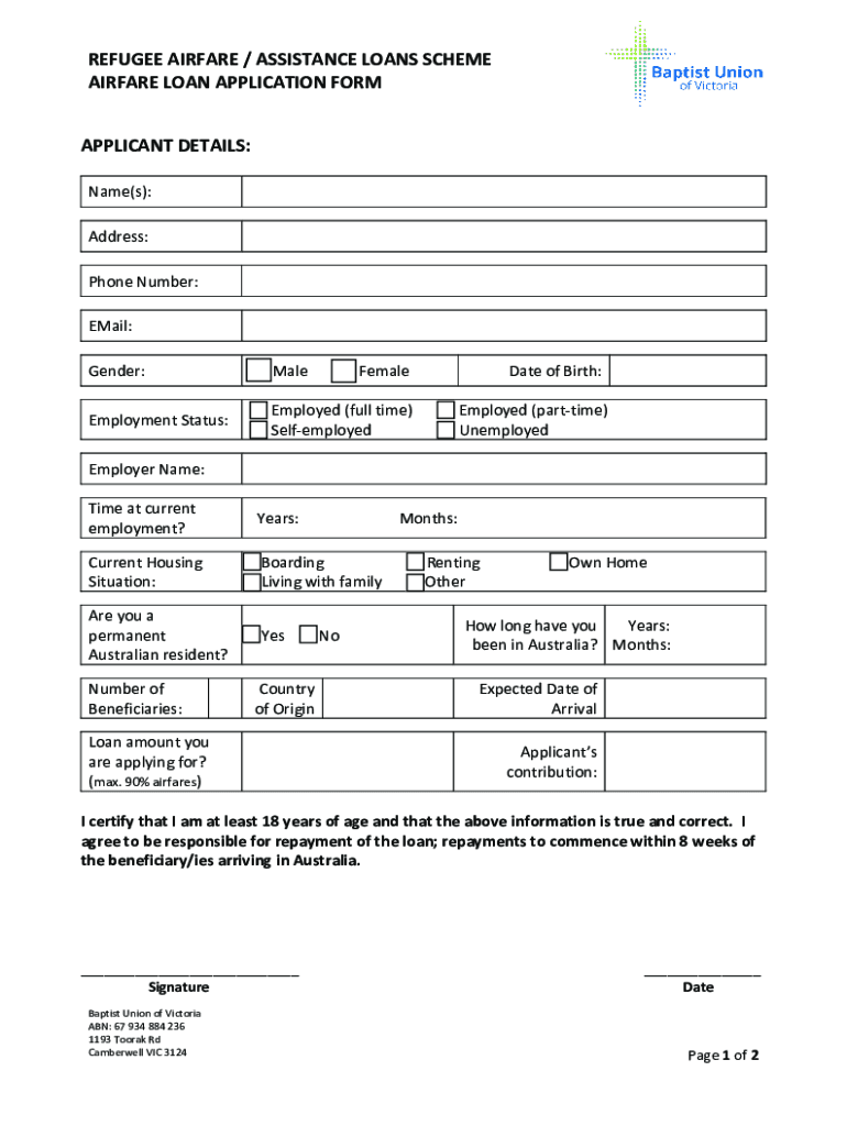REFUGEE AIRFARE / ASSISTANCE LOANS SCHEME AIRFARE LOAN APPLICATION FORM APPLICANT DETAILS: Name(s): Address: Phone Number: Email: Gender:MaleFemaleEmployment Status:Employed (full time) SelfemployedDate