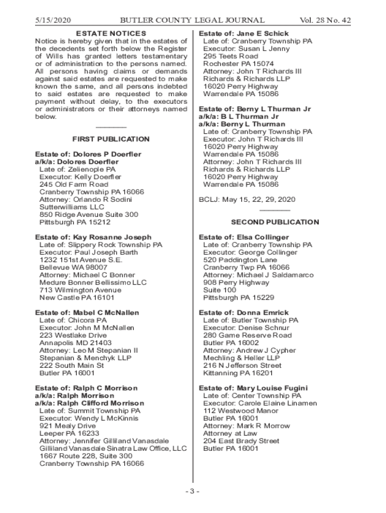 5/15/2020BUTLER COUNTY LEGAL JOURNALESE NOTICES Notice is hereby given that in the estates of the decedents set forth below the Register of Wills has granted letters testamentary or of administration