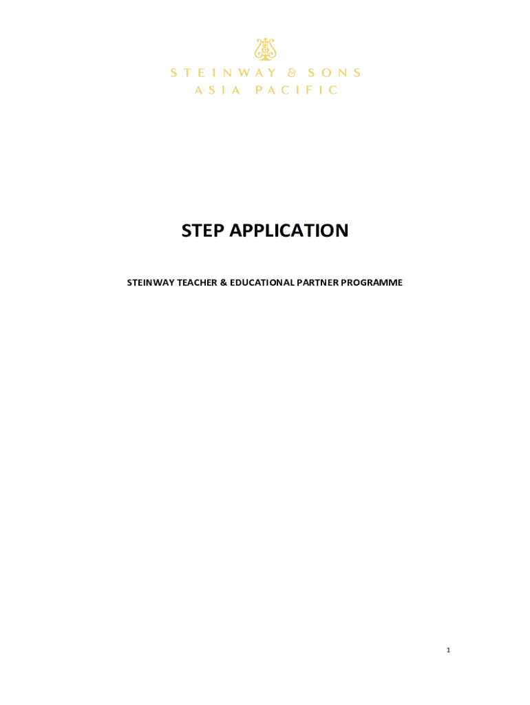 STEP APPLICATIONSTEINWAY TEACHER & EDUCATIONAL PARTNER PROGRAMME1CONTACT Informational Name: ___Date of Birth: ___Country /Province: ___Mobile Phone: ___ Facebook (if applicable): ___Email ___ID Number