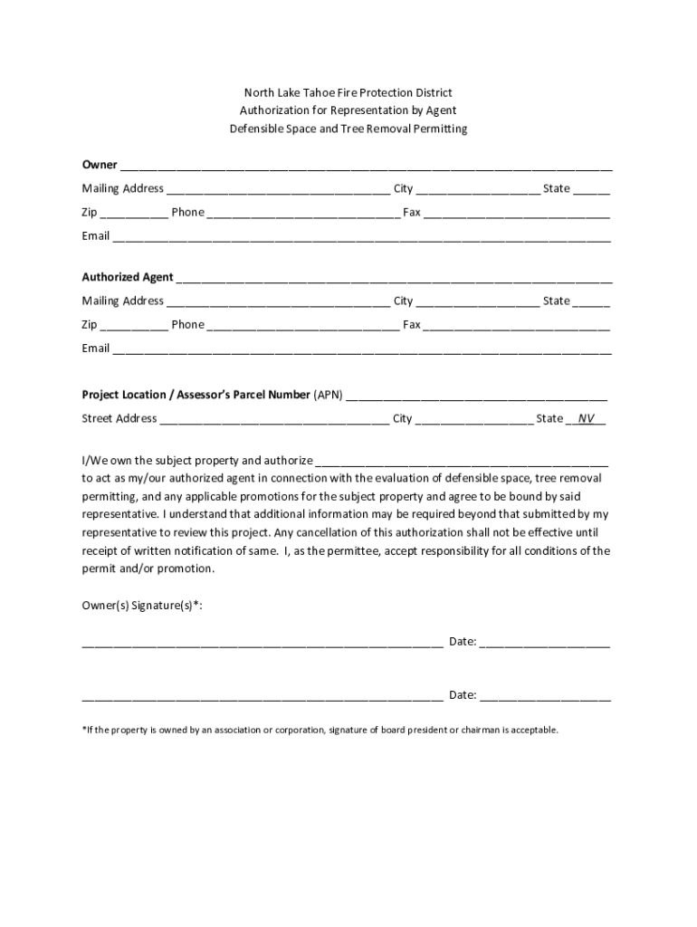 North Lake Tahoe Fire Protection District Authorization for Representation by Agent Defensible Space and Tree Removal Permitting Owner ___ Mailing Address ___ City ___ State ___ Zip ___ Phone ___