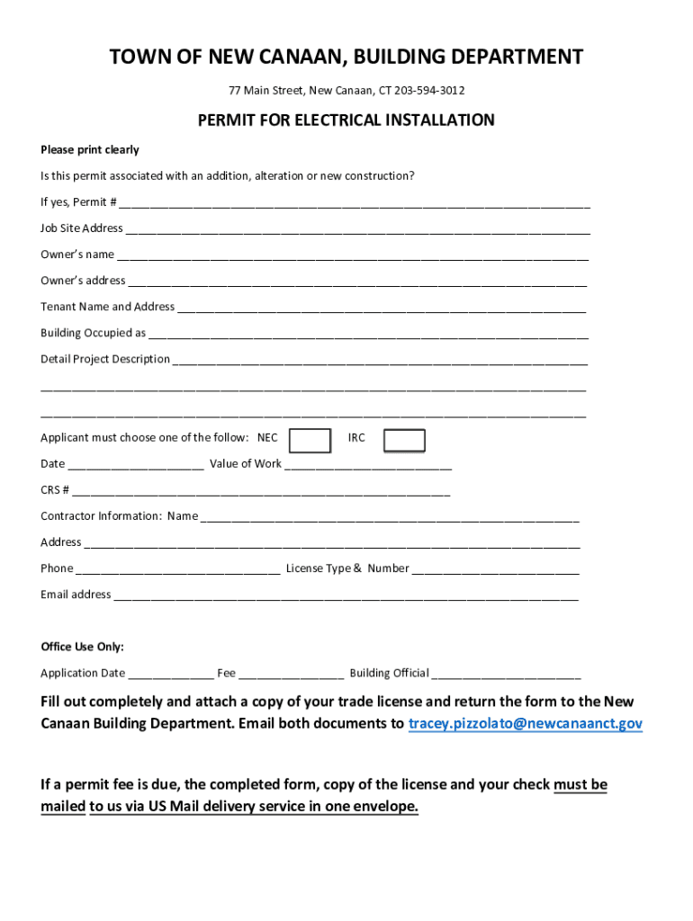 TOWN OF NEW CANAAN, BUILDING DEPARTMENT 77 Main Street, New Canaan, CT 2035943012PERMIT FOR ELECTRICAL INSTALLATION Please print clearly Is this permit associated with an addition, alteration or new
