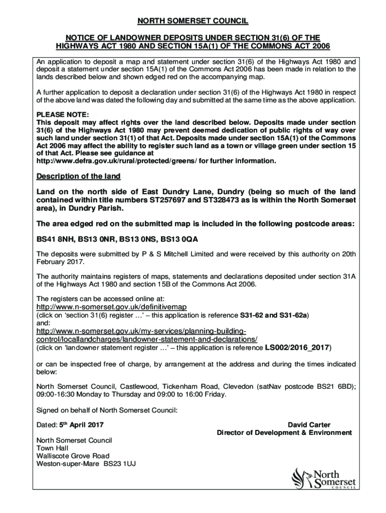 Get the free north somerset council notice of landowner deposits under ...