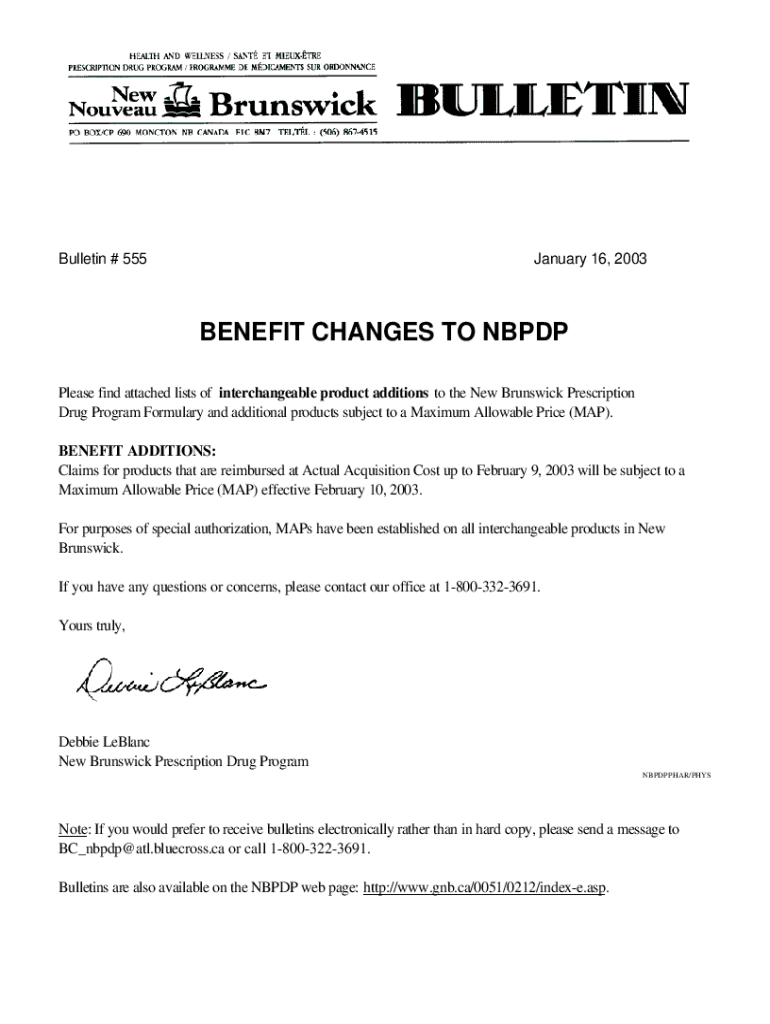 Bulletin # 555January 16, 2003BENEFIT CHANGES TO NB PDP Please find attached lists of interchangeable product additions to the New Brunswick Prescription Drug Program Formulary and additional products
