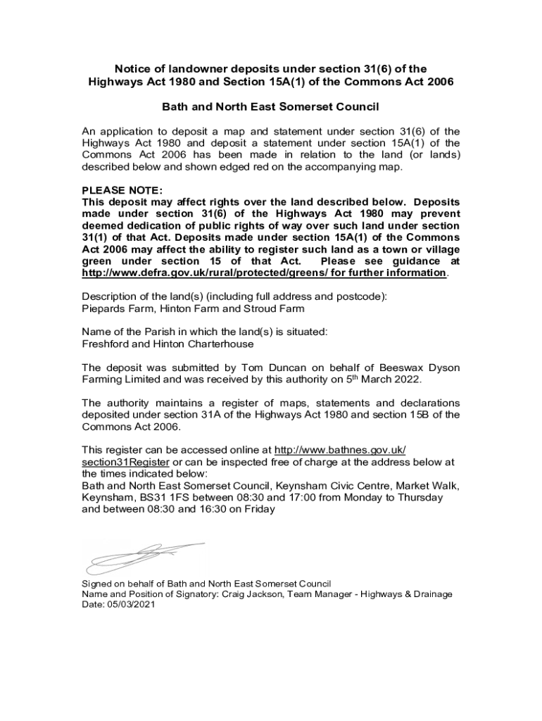 Notice of landowner deposits under section 31(6) of the Highways Act 1980 and Section 15A(1) of the Commons Act 2006 Bath and North East Somerset Council An application to deposit a map and statement