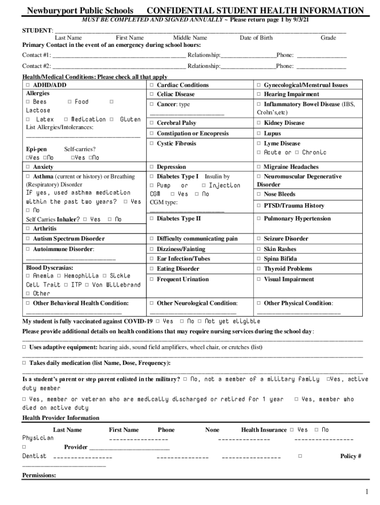 Newburyport Public SchoolsCONFIDENTIAL STUDENT HEALTH INFORMATIONMUST BE COMPLETED AND SIGNED ANNUALLY Please return page 1 by 9/3/21