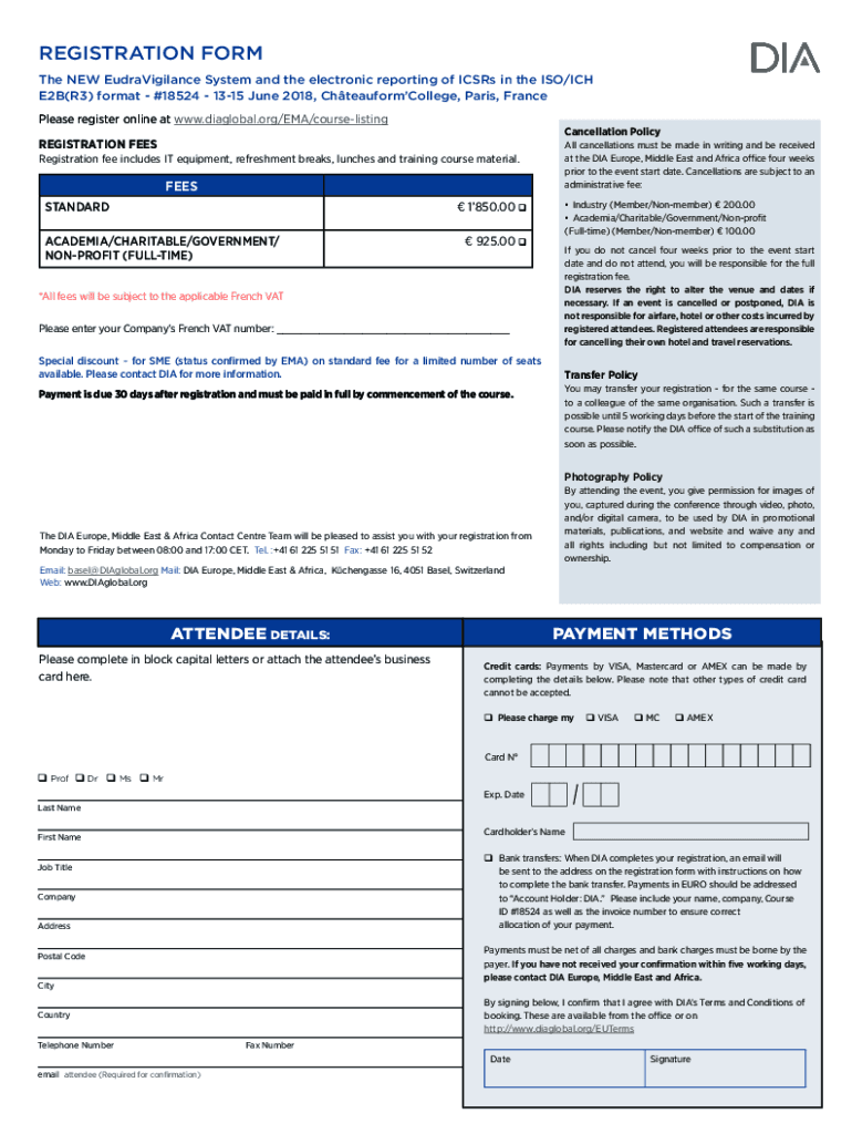 REGISTRATION FORM The NEW EudraVigilance System and the electronic reporting of Cars in the ISO/ICH E2B(R3) format #18524 1315 June 2018, ChteauformCollege, Paris, France Please register online at