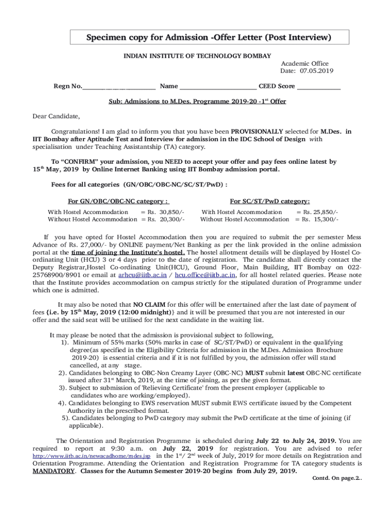 SpecimencopyforAdmissionOfferLetter(PostInterview)