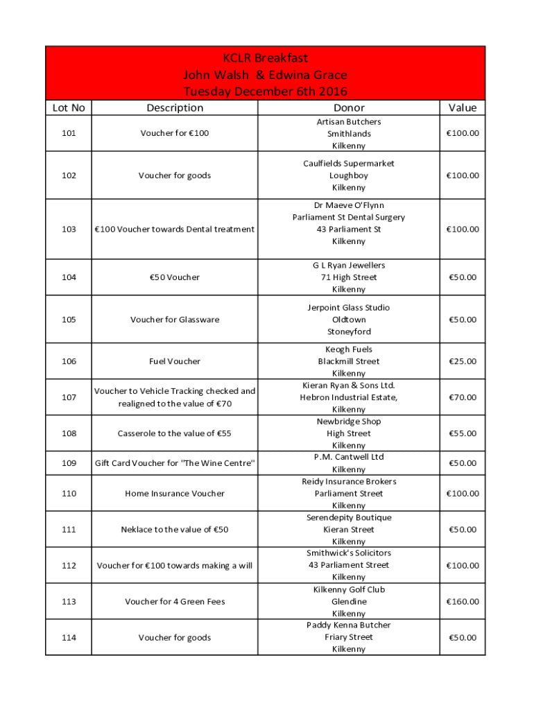 CLR Breakfast John Walsh & Edwina Grace Tuesday, December 6th 2016 Lot NoDescriptionDonorValue101Voucher for 100Artisan Butchers Smith lands Kilkenny100.00102Voucher for goodsCaulfields Supermarket