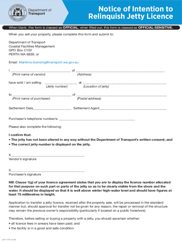 Department of TransportNotice of Intention to Relinquish Jetty LicenceWhen blank, this form is classed as OFFICIAL, when filled out, this form is classed as OFFICIALSENSITIVE. When you sell your property,