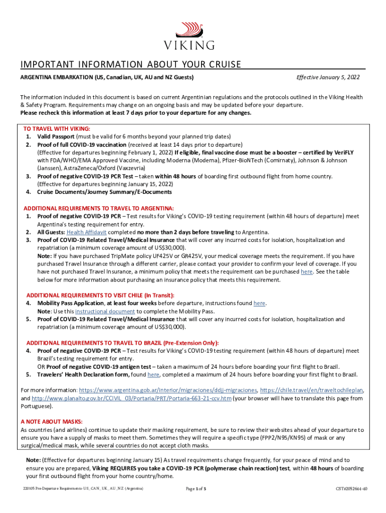 IMPORTANT INFORMATION ABOUT YOUR CRUISE ARGENTINA EMBARKATION (US, Canadian, UK, AU and NZ Guests)Effective January 5, 2022The information included in this document is based on current Argentinian