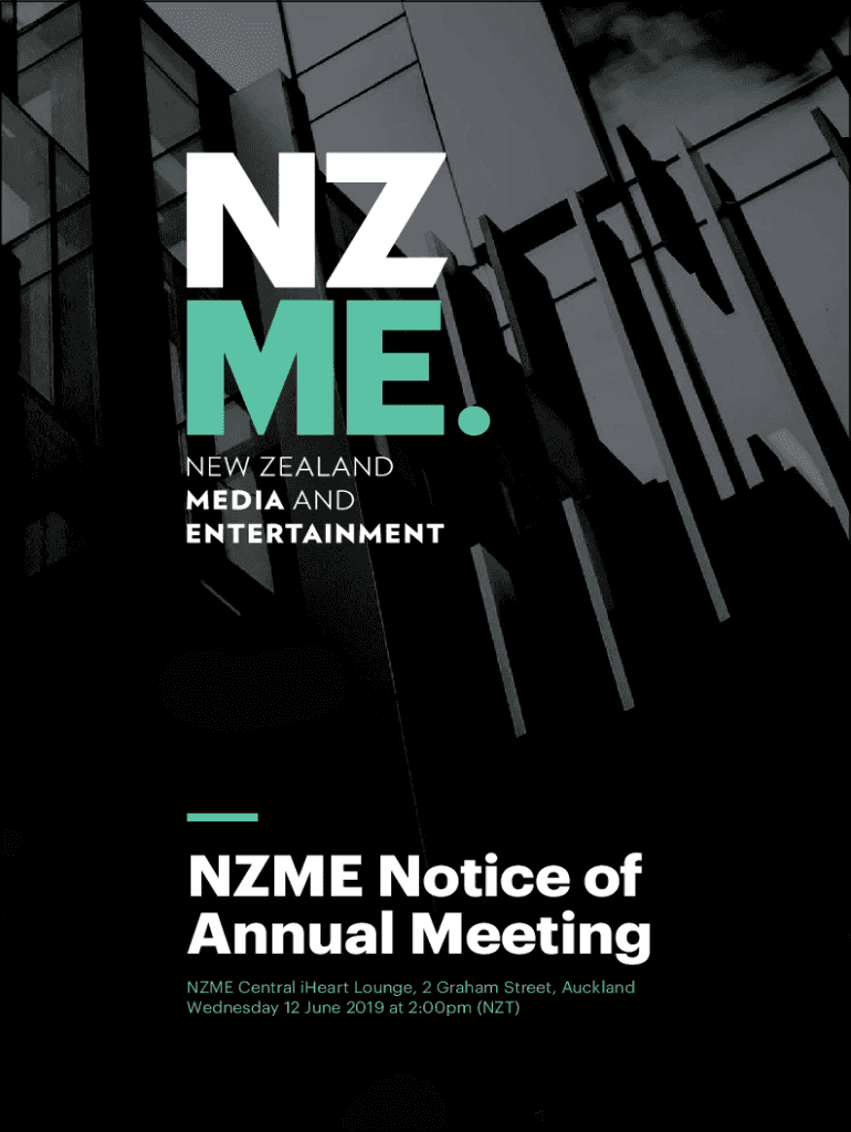 NAME Notice of Annual Meeting NAME Central heart Lounge, 2 Graham Street, Auckland Wednesday 12 June 2019 at 2:00pm (NOT)EXPLANATORY NOTESNZME NOTICE OF ANNUAL MEETINGDear Shareholder, NAME Limited