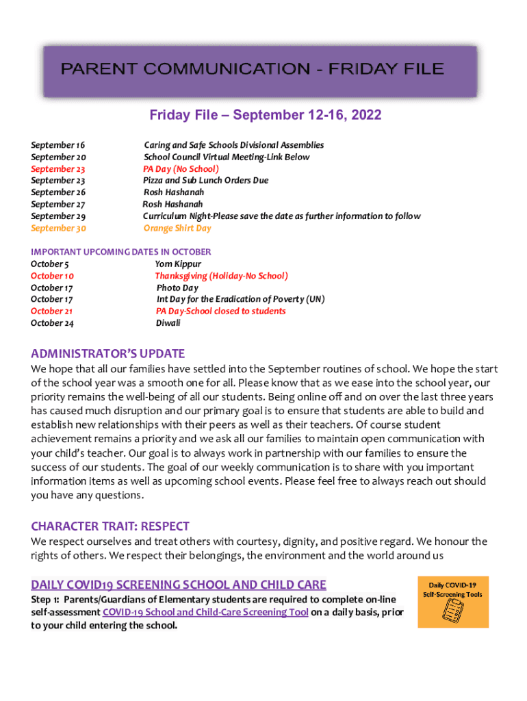 Friday File September 1216, 2022 September 16 September 20 September 23 September 23 September 26 September 27 September 29 September 30Caring and Safe Schools Divisional Assemblies School Council