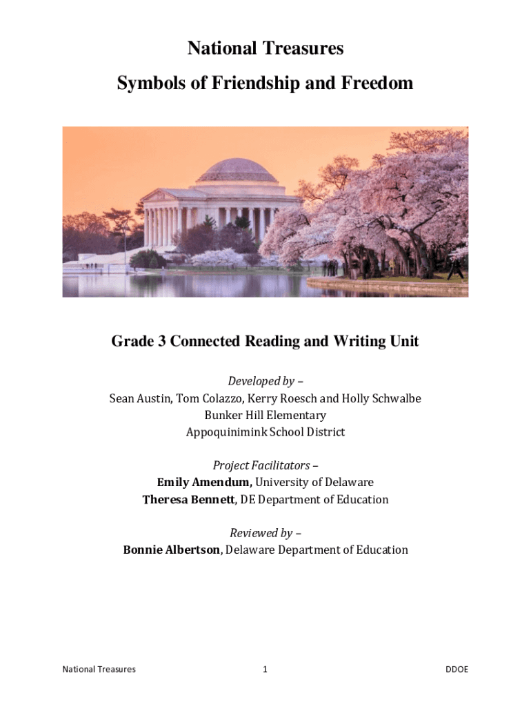 National Treasures Symbols of Friendship and FreedomGrade 3 Connected Reading and Writing Unit Developed by Sean Austin, Tom Palazzo, Kerry Roe sch and Holly Schalke Bunker Hill Elementary Appoquinimink