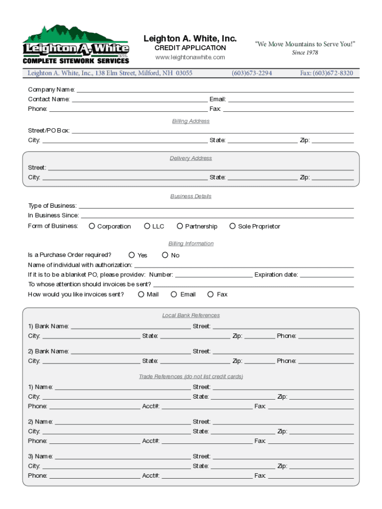 Leighton A. White, Inc. We Move Mountains to Serve You!CREDIT APPLICATIONSince 1978www.leightonawhite. Creighton A. White, Inc., 138 Elm Street, Milford, NH 03055(603)6732294Fax: (603)6728320Company