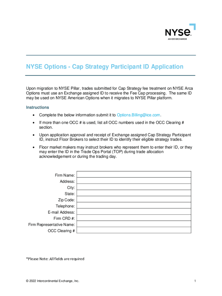 NYSE Options Cap Strategy Participant ID ApplicationUpon migration to NYSE Pillar, trades submitted for Cap Strategy fee treatment on NYSE Area Options must use an Exchange assigned ID to receive
