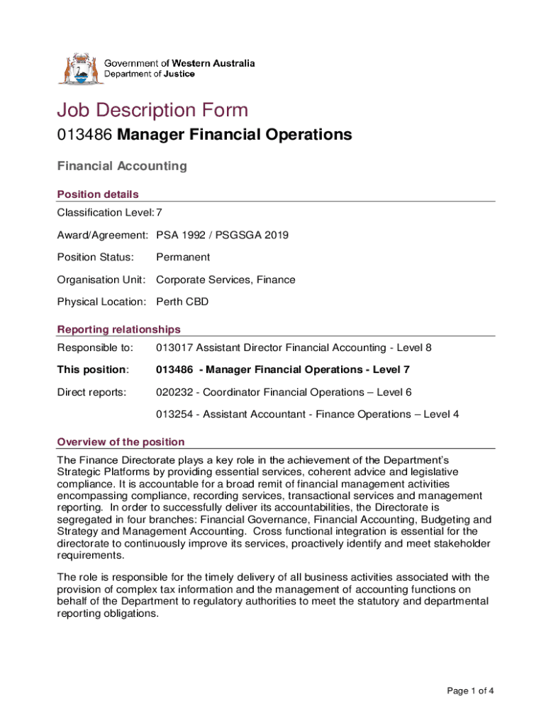 Job Description Form 013486 Manager Financial Operations Financial Accounting Position details Classification Level: 7 Award/Agreement: PSA 1992 / PSG SGA 2019 Position Status:PermanentOrganisation