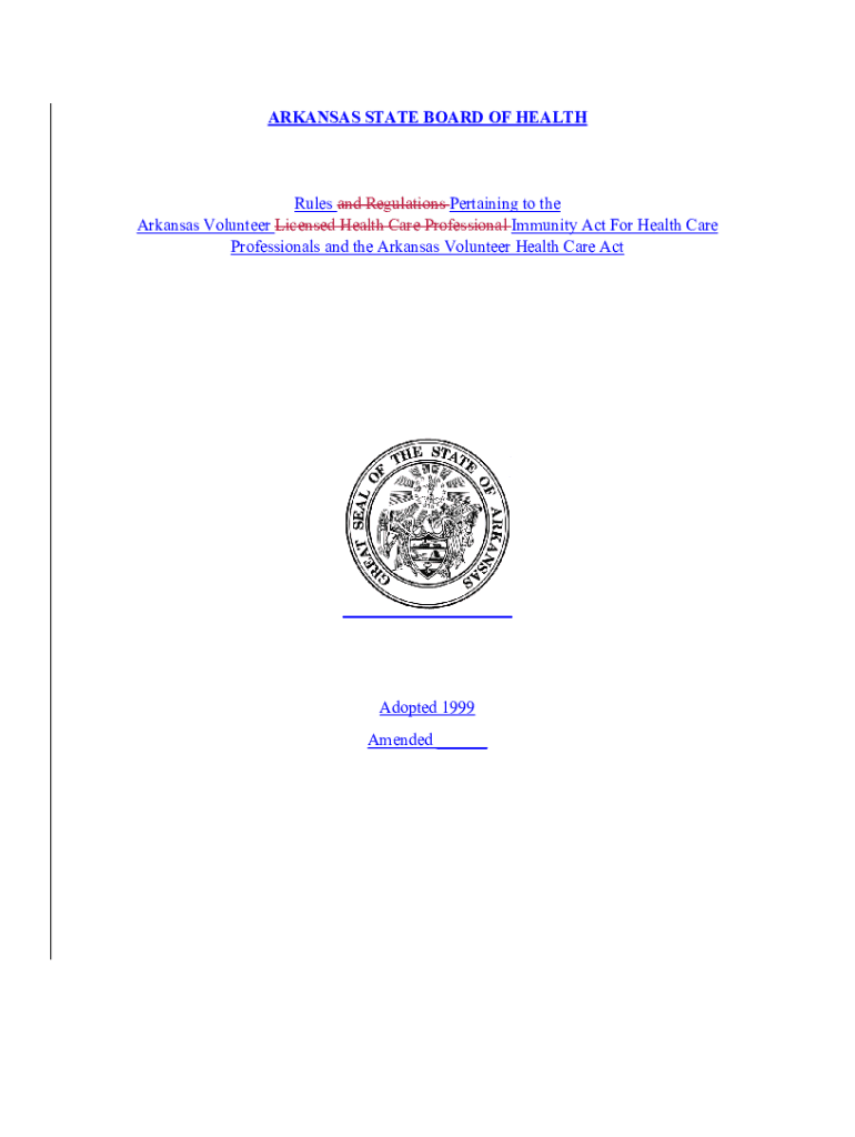 ARKANSAS STATE BOARD OF Healthful and Regulations Pertaining to the Arkansas Volunteer Licensed Health Care Professional Immunity Act For Health Care Professionals and the Arkansas Volunteer Health