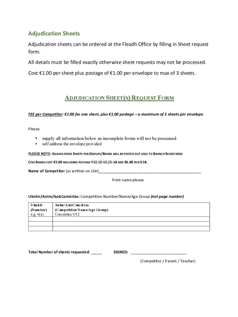 Adjudication SheetsAdjudication sheets can be ordered at the Lead Office by filling in Sheet request form. All details must be filled exactly otherwise sheet requests may not be processed. Cost 1.00 per sheet plus postage of 1.00 per envelope to max of 3 sheets.